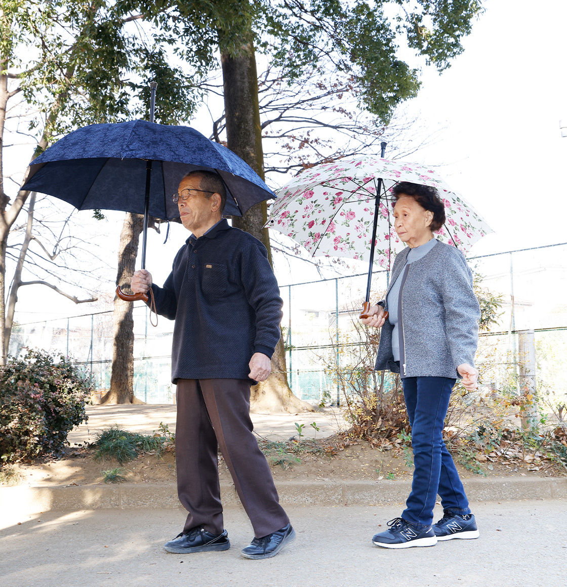 ステッキとしての強度を求めると雨傘としては重量増となってしまいます。試行錯誤のすえ、「つえがさ」のシャフトにはアルミニウム素材を、受け骨・親骨にはFRPを使用。徹底的に軽量かつ高強度を目指しました。さらに、「つえがさ」を長くご愛用いただけるように、先端に相当する石突きには、交換可能な滑り止めゴムを使用しています。